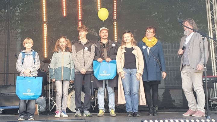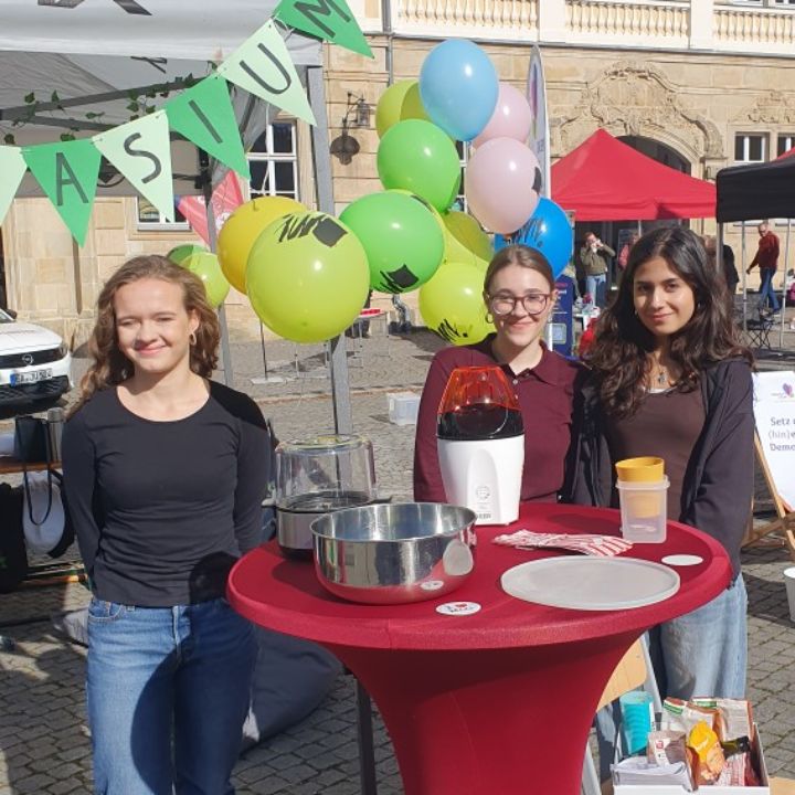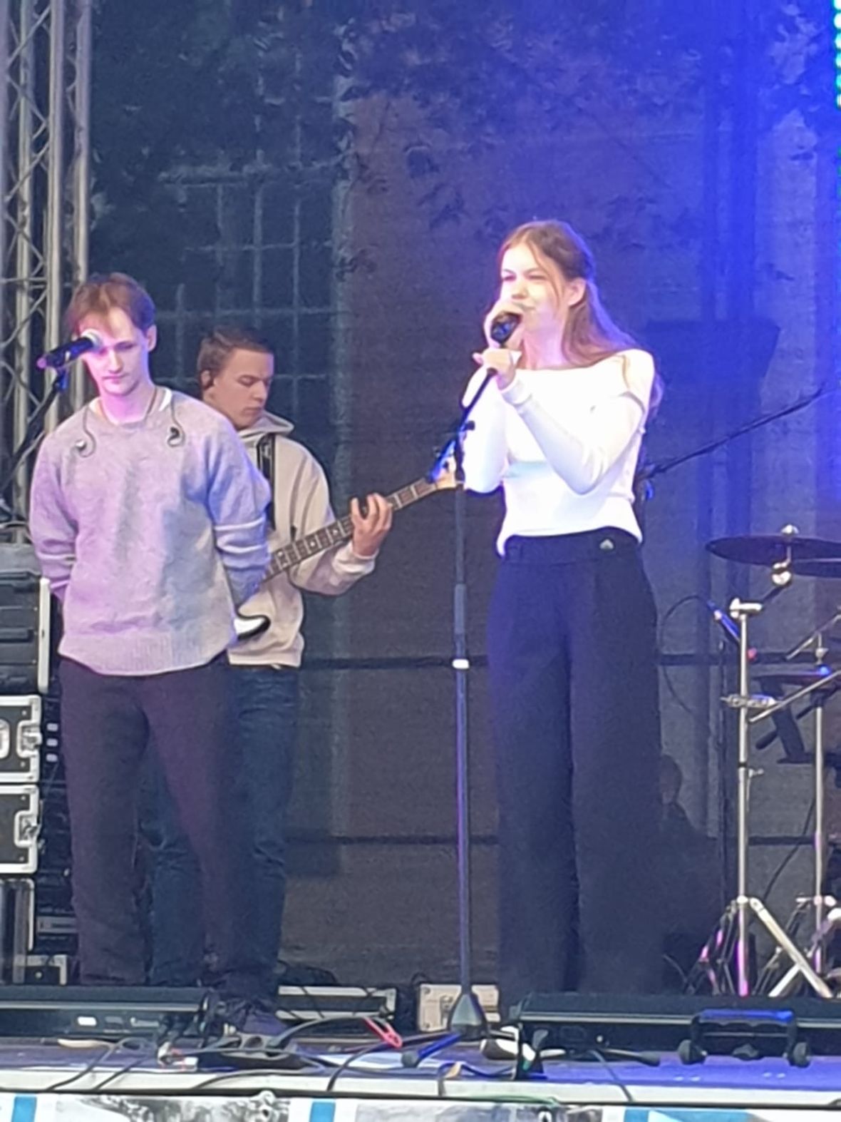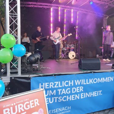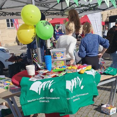 18.10.2025Am 3. Oktober 2025 nahm das Martin-Luther-Gymnasium am Bürgerfest der Stadt Eisenach teil. Schüler der Klassen 10/1 und 10/2 hatten einen Informationsstand geplant und aufgebaut, an dem sich interessierte Mitbürger über die Schule informieren konnten, an einem Demokratiequiz teilnehmen konnten oder kleine Präsente wie Kugelschreiber, Luftballons oder auch Popcorn bekommen konnten. Zudem sprachen die engagierten Schüler viele Menschen auf dem ganzen Fest an und verteilten Flyer. Die Resonanz war sehr positiv, insbesondere das Quiz und die Kugelschreiber waren sehr gefragt. Am Abend trat unsere Schulband auf und belebte den Markt mit einem Mix aus Pop- und Rockmusik.
